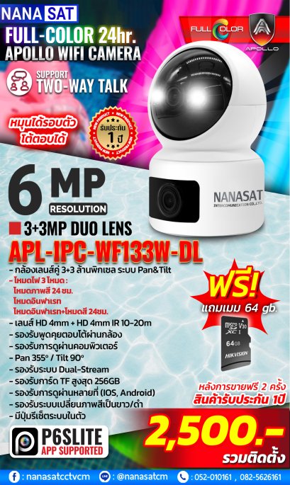 กล้องวงจรปิดไร้สายเชียงใหม่ Apollo รุ่น APL-IPC-WF133W-DL 3MP ภายใน กล้องวงจรปิดเชียงใหม่ หลังการขายฟรี 2ครั้ง สินค้ารับประกัน1ปี 2,500.- (รวมติดตั้งพร้อมเดินสายไฟ) แถมฟรี เมมโมรี่การ์ด 64 Gb.สนใจติดต่อ : 082-5626161 , 086-6701900 Line: @nanasatcm