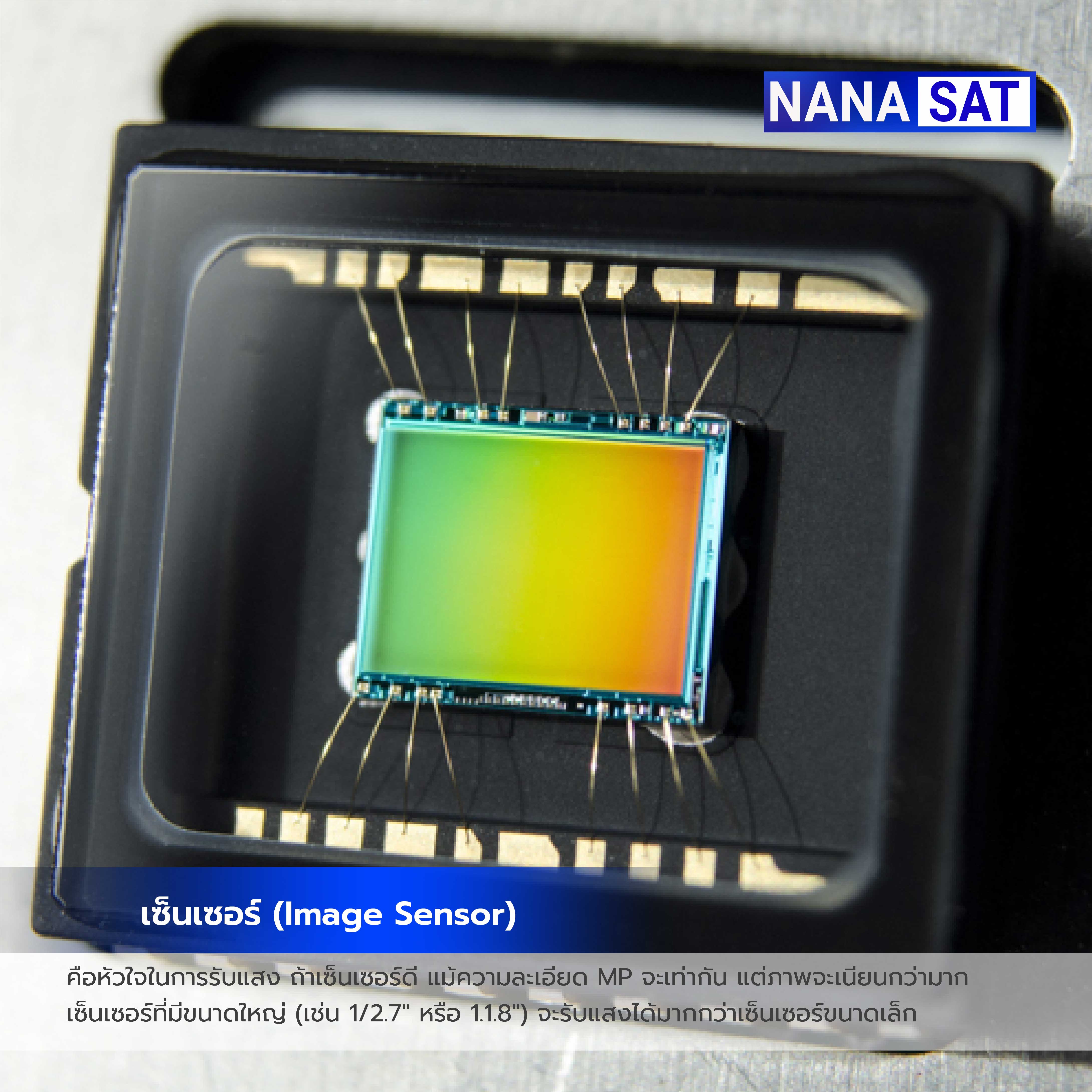 คือหัวใจในการรับแสง ถ้าเซ็นเซอร์ดี แม้ความละเอียด MP จะเท่ากัน แต่ภาพจะเนียนกว่ามาก เซ็นเซอร์ที่มีขนาดใหญ่ (เช่น 1/2.7" หรือ 1.1.8") จะรับแสงได้มากกว่าเซ็นเซอร์ขนาดเล็ก